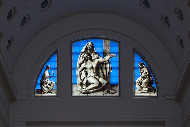 Als man im Jahre 2015 die Kirchenfenster einweihte, die Michael Triegel für die Pfarr- und Schlosskirche St. Maria im sachsen-anhaltinischen Köthen geschaffen hat, wurde kritisiert, dass sich zwischen den Figuren auf den Fenstern und der Familie des Malers optische Ähnlichkeiten finden ließen. Insbesondere eine gewisse Übereinstimmung seiner eigenen Gesichtszüge mit denen Jesu, der hier nach dem Kreuzestod auf dem Schoß seiner Mutter Maria gezeigt wird, sorgte für einiges Kopfschütteln. „Ja, ganz recht: Der Jesus Christus in der Schlosskirche zu Köthen trägt das fünftagebärtige Antlitz von Michael Triegel“[1], hieß es damals in der Wochenzeitung DIE ZEIT. Zwar sei im Laufe der Einweihungsfeier immer wieder „vom Künstler als demütigem Werkzeug Gottes“[2] die Rede gewesen. Dem stehe aber entgegen, „dass dort oben in Überlebensgröße Michael Triegel als Erlöser schwebt“[3], was eher für die überschießende Selbstliebe des Künstlers spreche.