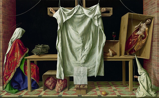 Der Grund für diesen gebrochenen Zugang zur christlich-religiösen Tradition ist ihre aufklärerische Desillusionierung, von der auch Triegel ausgeht. Allein durch die spielerische Aneignung dessen, was in der Vergangenheit noch selbstverständlich funktioniert hat, können wir uns demnach heute noch dem Göttlichen annähern. Dass es sich beispielsweise bei einem Christusbild nur um eine „Näherung“ handeln kann, nicht aber um ein Bild des Dargestellten selbst, wird dabei von Triegel ausdrücklich betont – verbunden mit dem Hinweis, „dass wir als Menschen im Hier und Jetzt […] die Möglichkeit einer Näherung brauchen“.[15] Die konkrete Darstellung der Christusfigur soll aber der Anlass einer vertiefteren Auseinandersetzung sein, die den Betrachter über das Bild hinausführt.